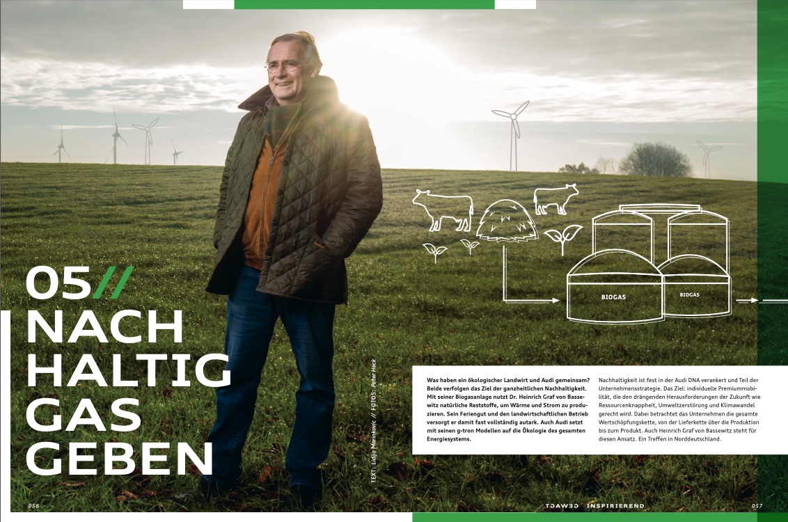 Feature des Audi g-tron, betrieben mit Biogas im Audi Geschäftsbericht. Der Landwirt Dr. Graf von Bassewitz setzt sich seit vielen Jahren für die ökologische Landwirtschaft ein und ist unter anderem Betreiber einer Biogas-Anlage.